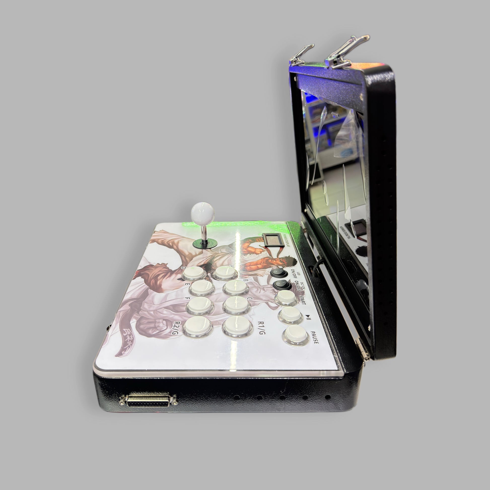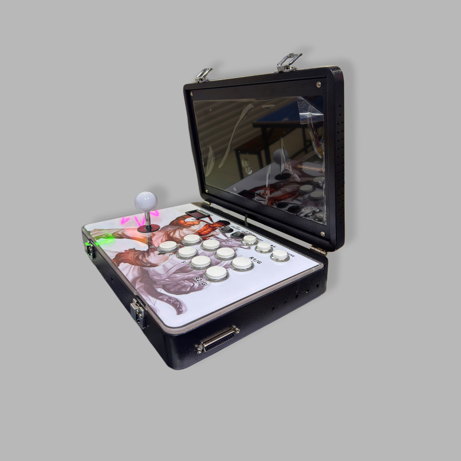 1. Diseño Portátil: El maletín arcade tiene un diseño que permite transportar la consola y los controles en una sola unidad. Su aspecto recuerda a una máquina arcade tradicional, pero con un tamaño reducido y más práctico para llevar de un lado a otro.